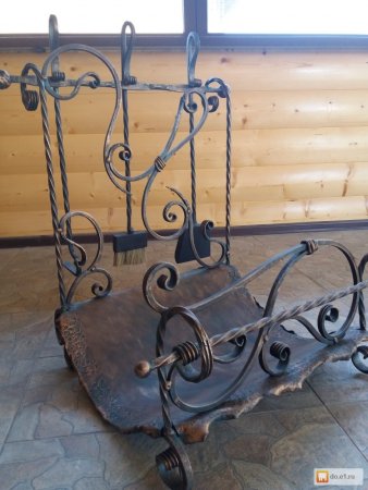 Кованый напольный каминный набор на 3 предмета с дровницей.