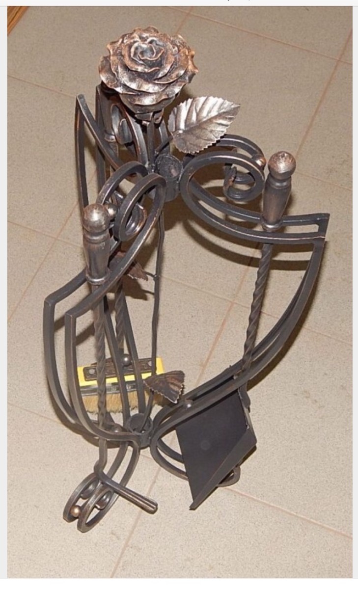 Стильный кованый каминный набор на 3 предмета с кованой розой в центре.