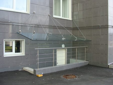 Стеклянный козырек на подвесах. Применяется триплекс – два и более слоев стекла, склеенных между собой полимерной пленкой, удерживающей осколки стекла при повреждении. Триплекс выпускается абсолютно прозрачным и различных цветов, может быть зеркальным.