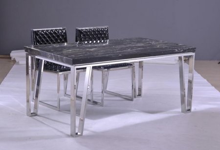 Стол и стулья из нержавеющей стали. Материал столешницы выполнен из искусственного мрамора. Создается впечатление, что столешница весит в воздухе за счет проставки между основанием стола и столешницей. Стулья обиты кожей. Напоминаю, что все материалы Вы вправе выбрать сами.