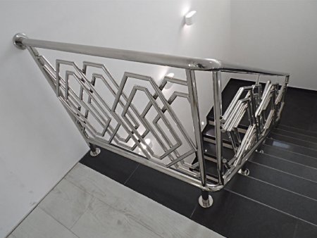 Перила из нержавейки Дизайн из комбинации круглых и квадратных форм. С круглыми стойками, заполненными геометрическим дизайном из 6-угольников. Нержавеющее ограждение крепится в пол, а так же с помощью бокового крепления к стене. Поделиться