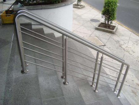 Перила из нержавейки Классическое, цельносварное перила для улицы из нержавеющей стали с вертикальными стойками, которые крепятся в пол. С тремя горизонтальными ригелями. Поделиться