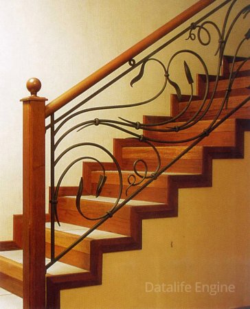 Кованые перила на лестницу с деревянным обрамлением.
