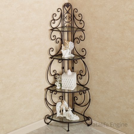Кованый угловой стеллаж со стеклянными полками.