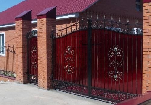 Распашные ворота. Кованые распашные ворота с калиткой закрытого типа. Материал которым зашиты ворота с калиткой - сотовый поликарбонат вишневого цвета. Поделиться