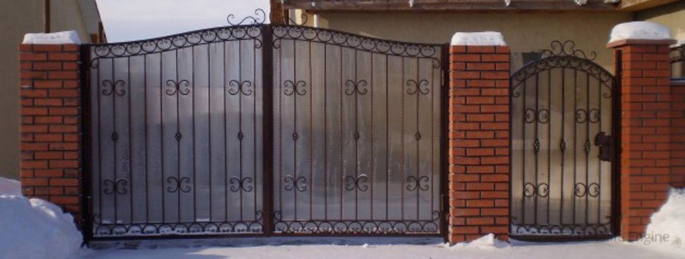 Кованые распашные ворота. Ворота и калитка зашиты сзади поликарбонатом.