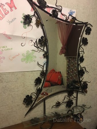 Кованое зеркало Кованая рама для зеркала необычной формы, с полкой для обуви в прихожую. С обрамлением в форме виноградной лозы и виноградными гроздьями. Поделиться